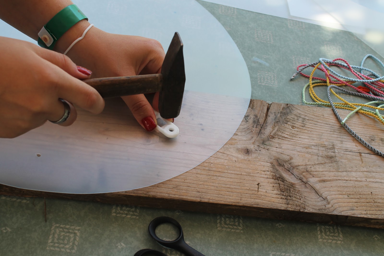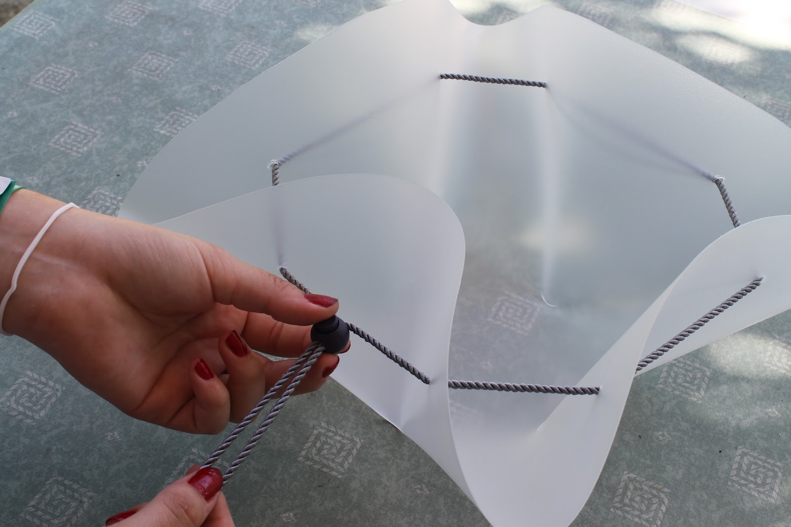 Készítsünk sablont. Vágjunk ki újságpapírból egy 45 cm átmérőjű kört. Osszuk fel nyolc egyenlő részre. A szélétől 4,5 cm re minden osztáson jelöljük be a lyukak helyét. Helyezzük rá a sablont a polipropilén lapra és rajzoljuk körbe. Ne feledkezzünk meg a lyukak jelöléséről sem. Ollóval vágjuk ki a kör-formát. Helyezzük egy falapra és egy lyukasztó segítségével üssük ki mind a nyolc lyukat. Vágjunk le a sodrott zsinórból egy kb. 120-140 cm-es darabot. Fűzzük át a lyukakon. Fogjuk össze a zsinór két végét és húzzuk bele az összehúzóba. A két végére pattintsuk rá a végzáró műanyagokat. A zsinór segítségével húzzuk össze a körlapot, miközben a közepét befelé nyomjuk. Ha jól csináljuk, egy mozdulat és máris használhatjuk a tálat.(szinesőtletek)